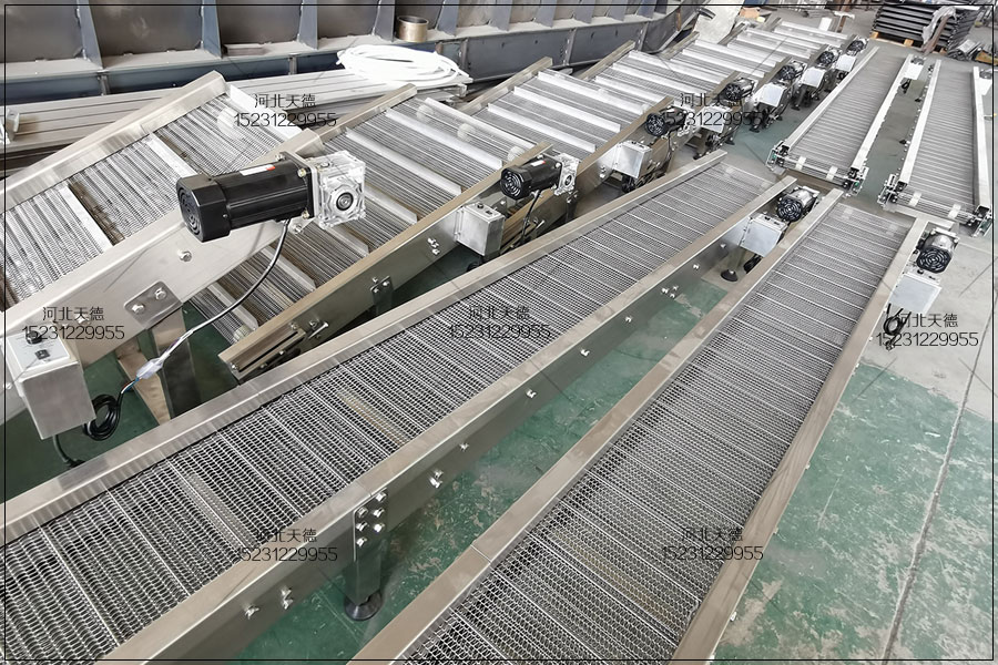 (3)鋼絲網帶 鋼絲網帶強度高,耐高溫。它具有網孔,網孔的大小可按需要選擇,多用于一邊輸送一邊固液分離的場合。如油炸食品爐中的物料輸送,水果洗滌設備中的水平輸送等常采用鋼絲網帶。鋼絲網帶用于烘烤食品設備中時,由于網帶網孔能透氣,故烘烤時食品生坯底部水分容易蒸發,其外形不會因脹發而變得不規則或發生油灘、洼底、粘帶及打滑等現象。網帶上積累的面屑碳黑不易清洗,致使制品底部粘上黑斑而影響食品質量。應對網帶涂鍍防粘材料來解決。
